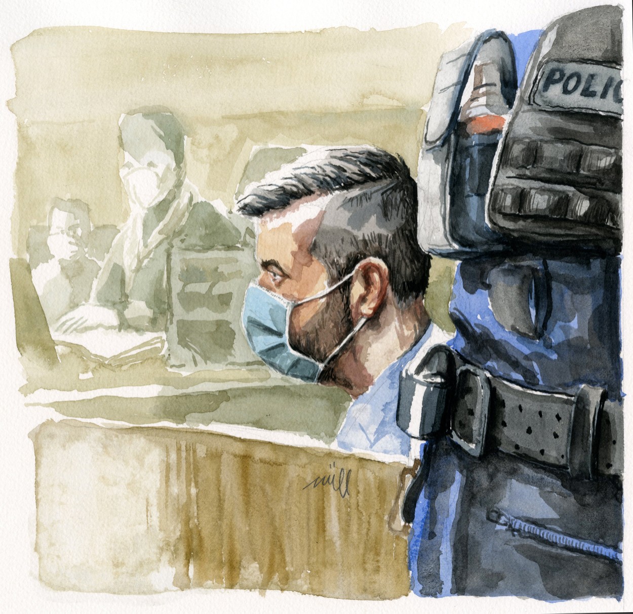 Je n’ai aucun contact avec le Ministère de la Justice. Mes accréditations sont délivrées par les secrétariats des différentes magistratures suivant l’endroit où se situe le procès. Le Ministère appose son tampon, c’est tout. J’ai une carte de presse judiciaire. Je fais partie d’une association validée par le Ministère qui regroupe les journalistes judiciaires. Je suis sous l’autorité du ou de la Présidente d’audience. Parfois, les tribunaux refusent de délivrer une accréditation s’ils ne vous connaissent pas. Il faut alors redoubler d’arguments pour montrer son professionnalisme. Parfois, on ne se trouve pas au bon endroit pour dessiner. Durant les premières audiences du procès Jubilar, on n’avait pas le droit d’être dans le carré et on ne voyait les gens que de dos. Du coup, les dessins sont moins percutants, c’est une vraie difficulté.