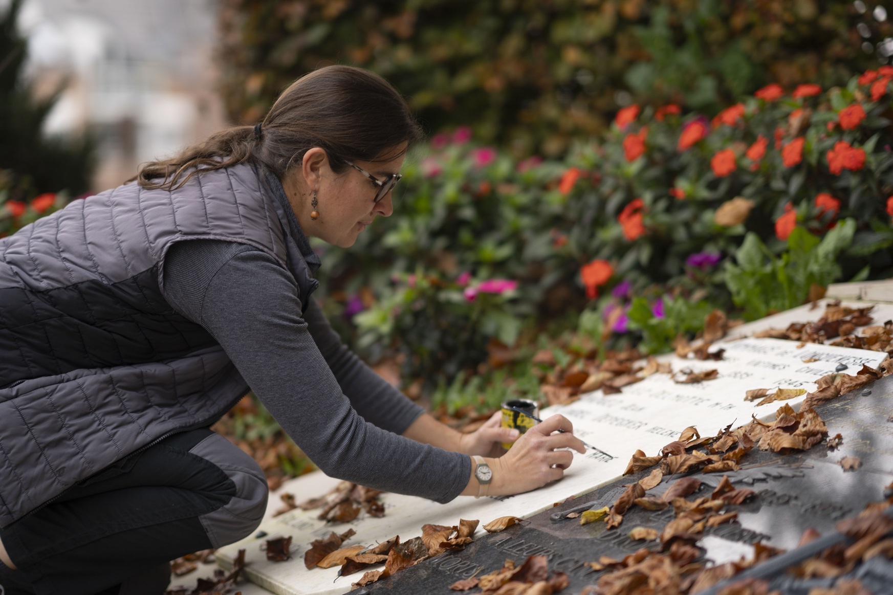« La gravure à la main s’impose dans la restauration quand la pierre est trop érodée ou si le client veut reproduire à l’identique une gravure à la main. La taille est plus longue, bien sûr. On trouve peu de formations en France pour la gravure à la main, souvent un CAP d’un an, mais en Belgique, il existe des modules d’une semaine à des prix très compétitifs organisés par la région wallonne. Nous sommes peu nombreuses dans la profession (davantage dans l’entretien des tombes) » explique Cécile, qui n’élude pas les difficultés techniques rencontrées avec la manipulation d’un matériel très lourd (sableuse, aspirateur, compresseur, tuyaux, épurateur d’air et treuil) sur des terrains difficiles.
